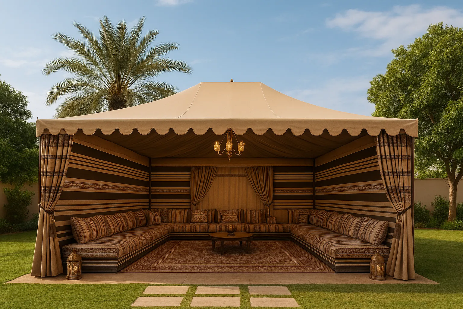 الخيام التقليدية: تتميز بالنقوش والزخارف العربية الأصيلة، مصنوعة من الصوف أو الشعر الطبيعي، وتستخدم غالبًا في المناسبات التراثية والرحلات الصحراوية.
